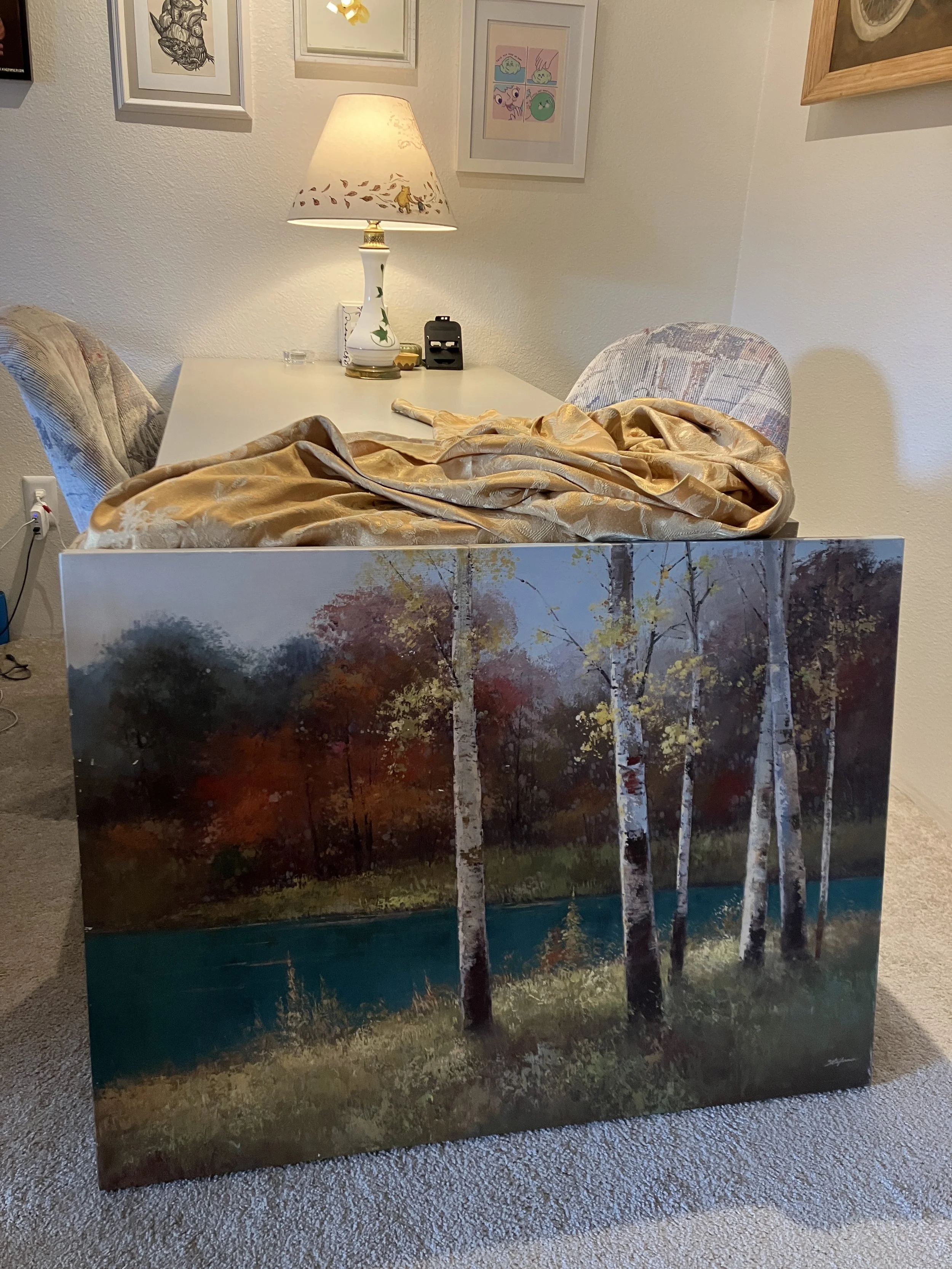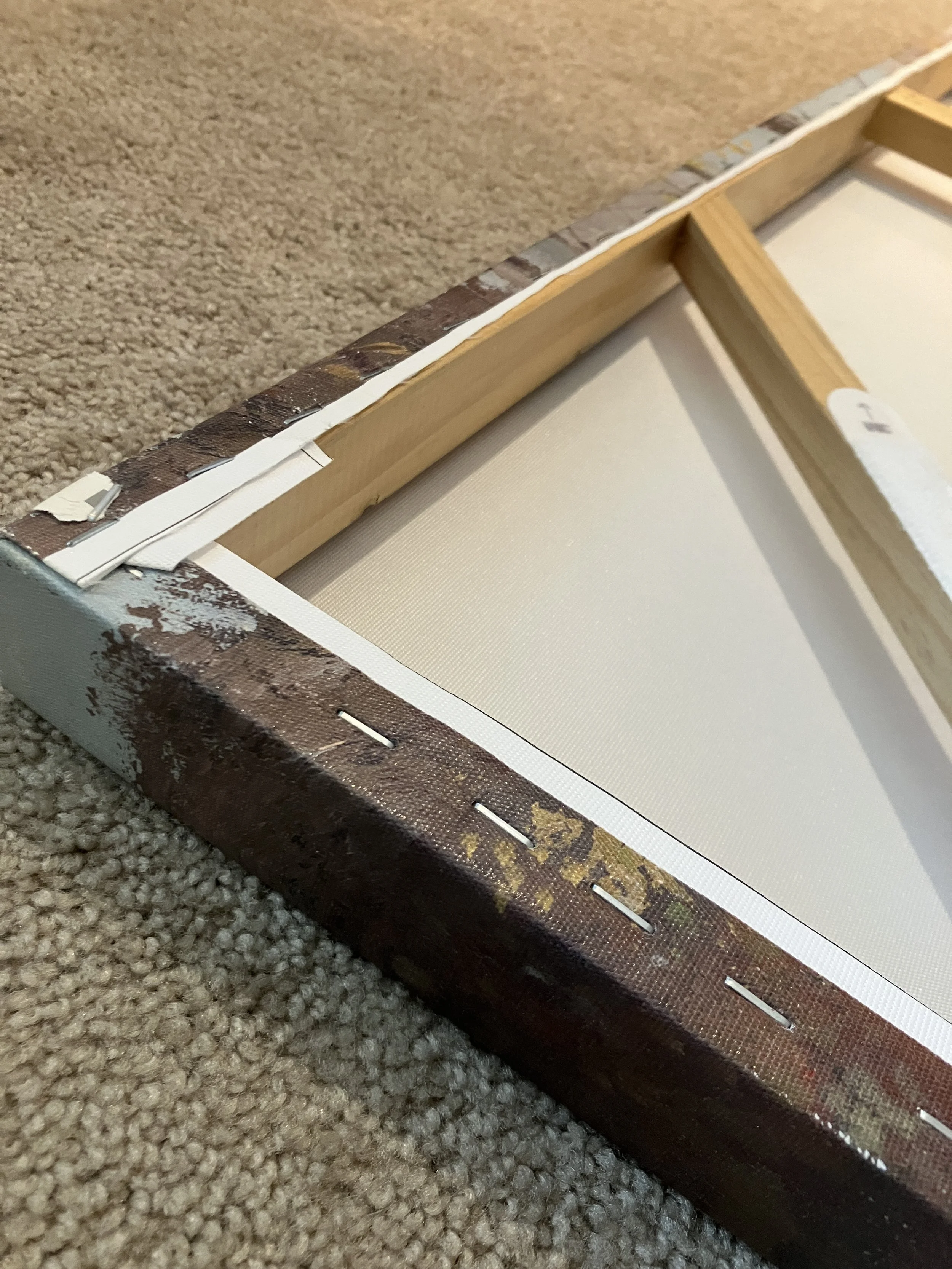 I’m upcycling the wood canvas frame from this wrapped reproduction print that my partner lovingly saved from the garbage for me. It was in perfect condition, not even a dent or tear in the printed canvas - it’s amazing what people will just throw away!