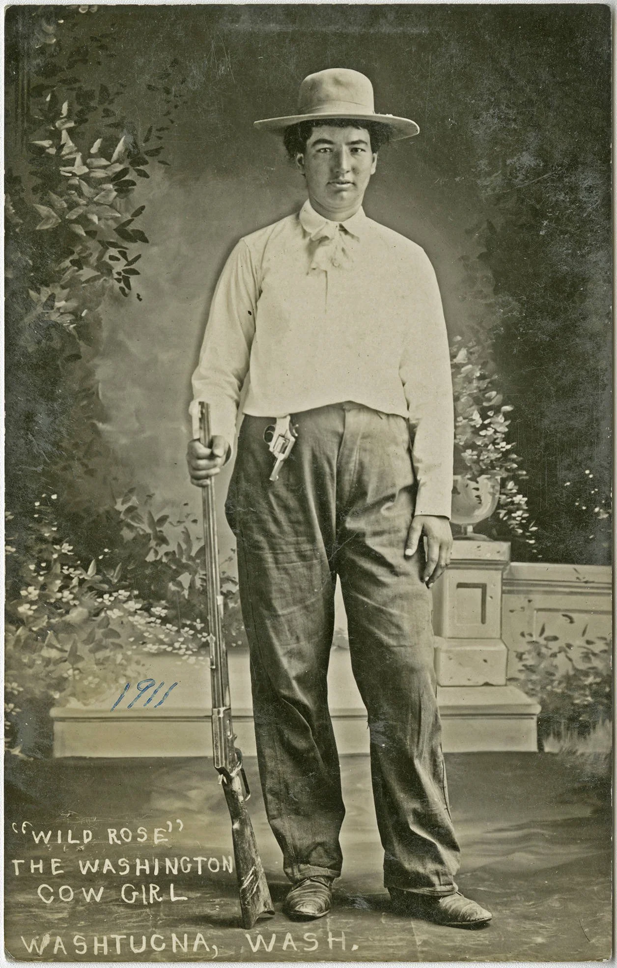 This image was taken of in 1911 in a photo studio set located in what is now the Post Office in Washtucna, WA. This woman, identified as “Wild Rose” The Washington Cow Girl, is otherwise unknown. She’s posing with scratched rifle and a pistol on her belt - She appears to be a rugged, working woman who did not conform to our typical modern understanding of early 1900’s femininity.